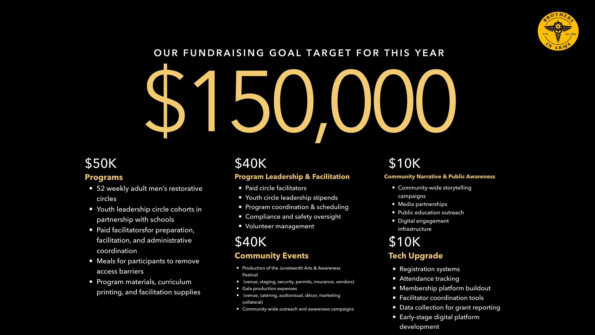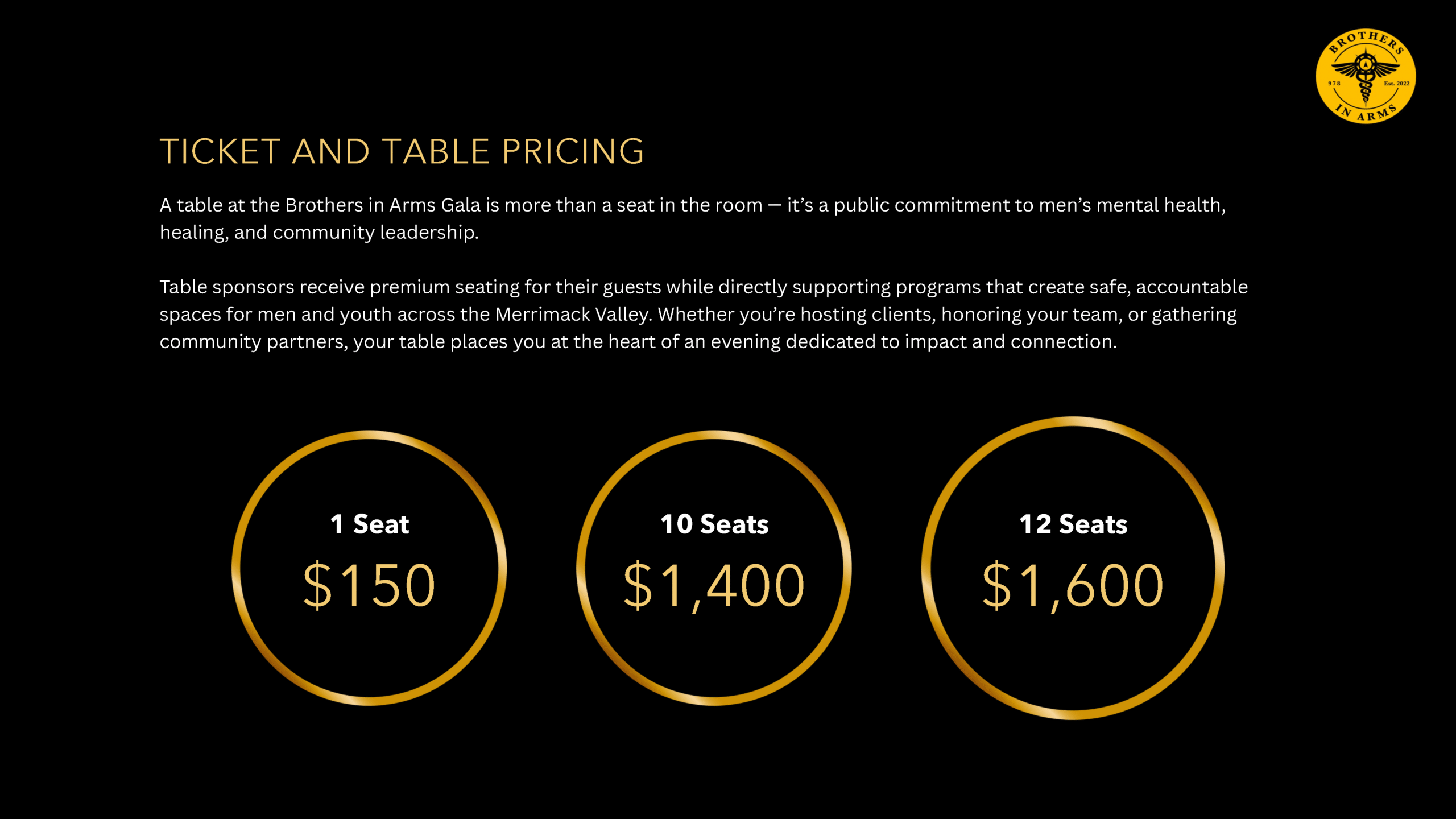 Whether you attend as an individual or gather friends, colleagues, or family around a table, the Brothers In Arms Gala is first and foremost a shared experience. This evening is designed to be enjoyed. Come for the atmosphere, the conversations, the stories, and the chance to connect with others who believe in community and growth. There is no expectation beyond showing up and being present. Your attendance alone helps support the mission and makes the night what it is.